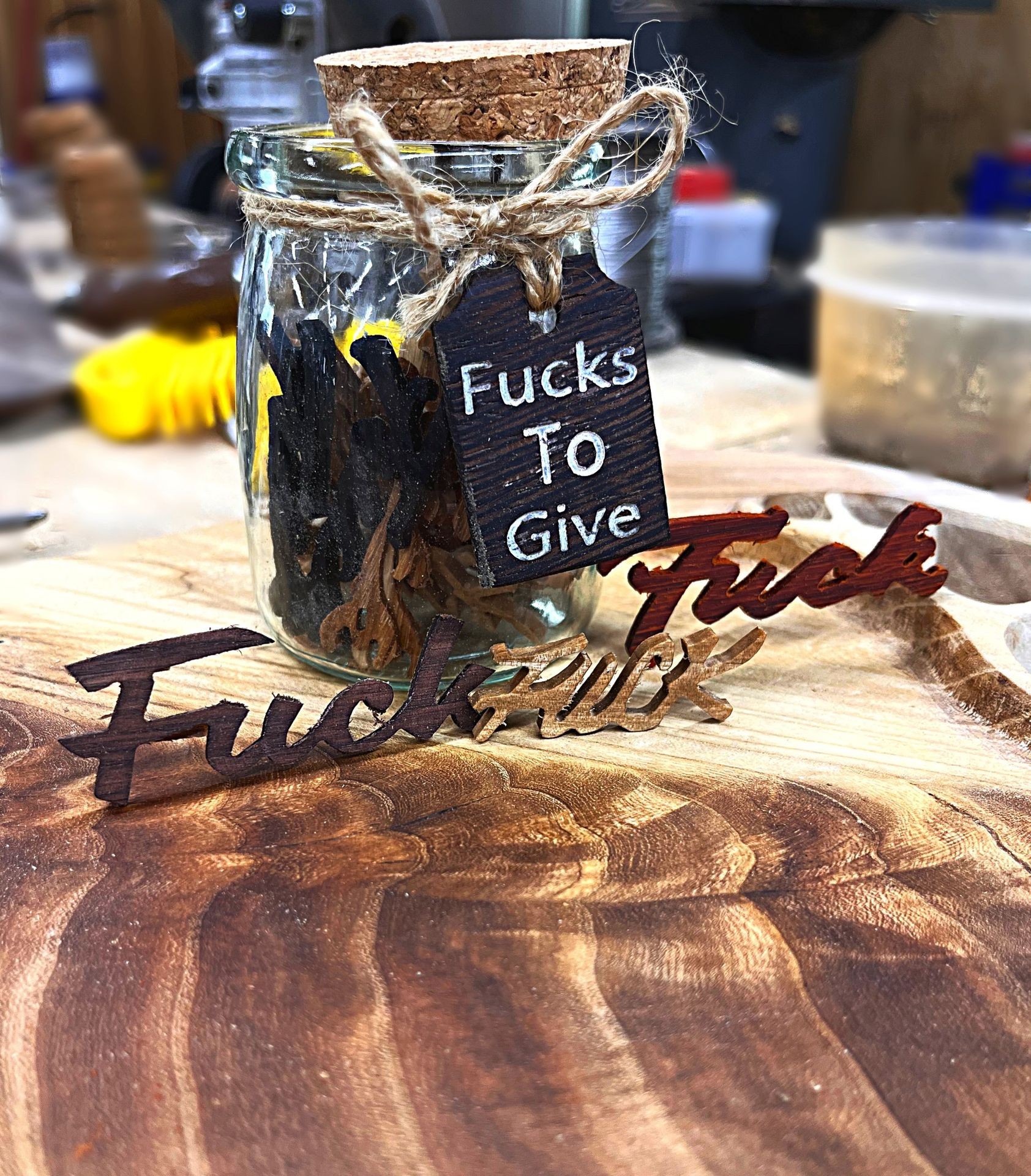 Little fun gift with some bold humor, this jar of "fucks" is sure to be the perfect gift. This glass jar with cork comes filled with 25 "fucks" of different wood types. This item is a perfect conversation piece for at the office.